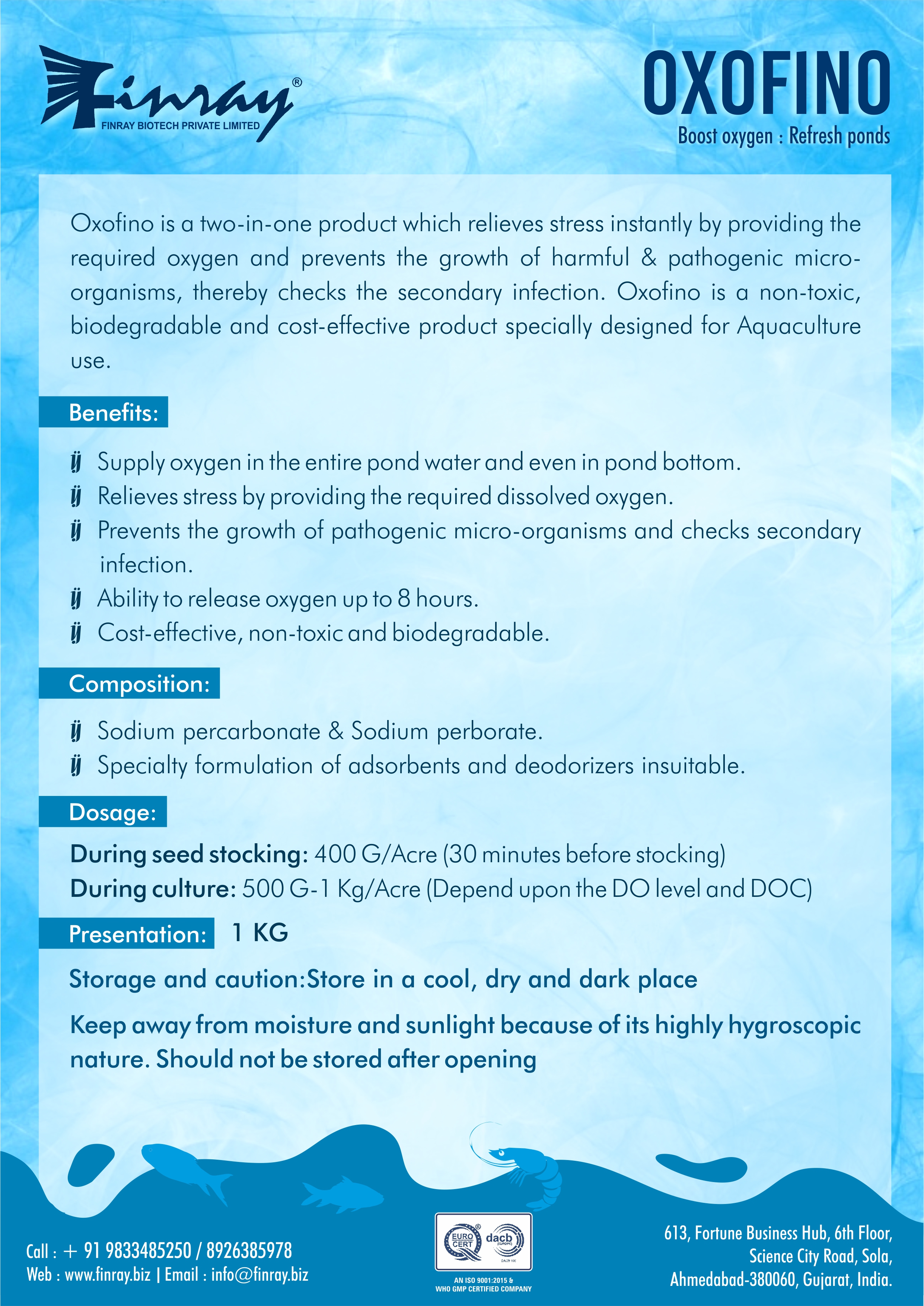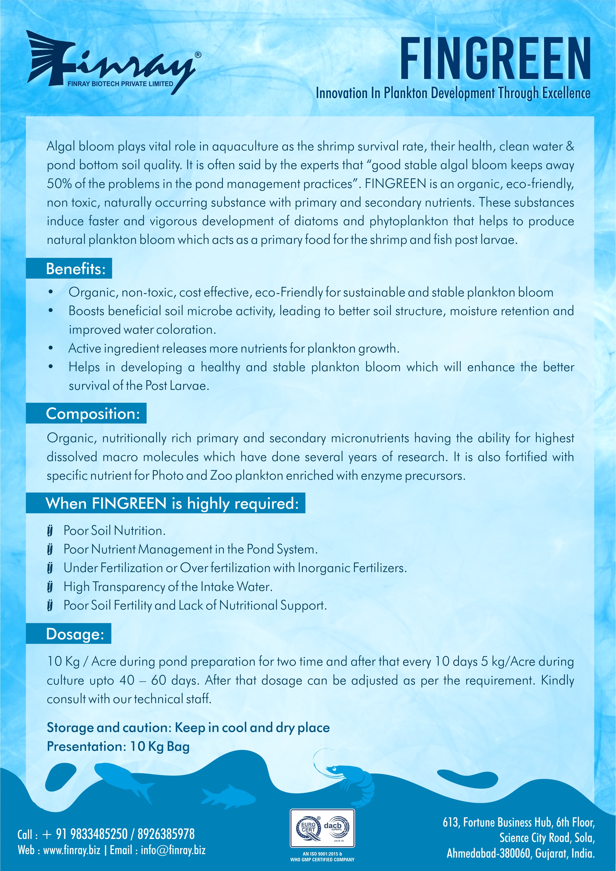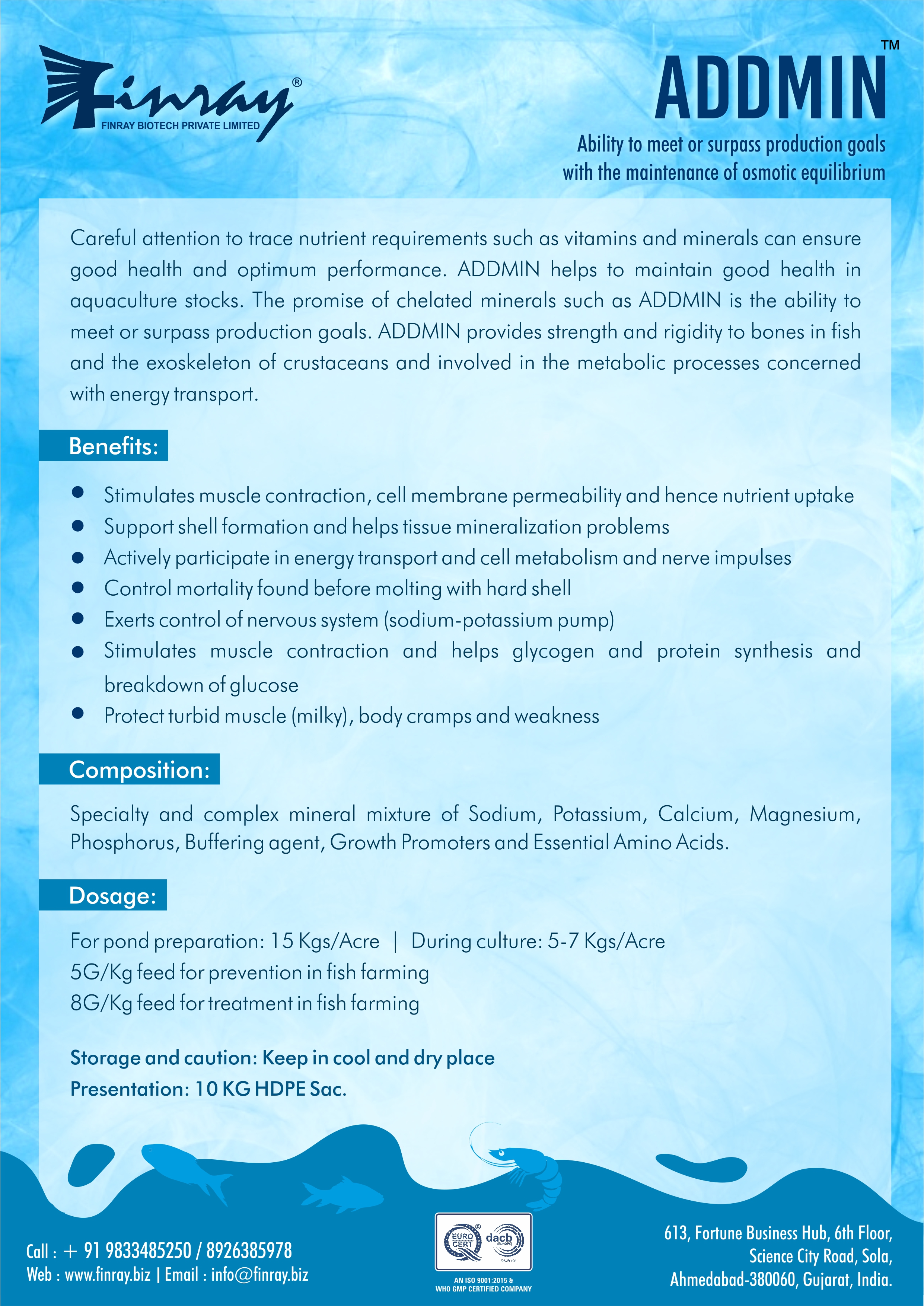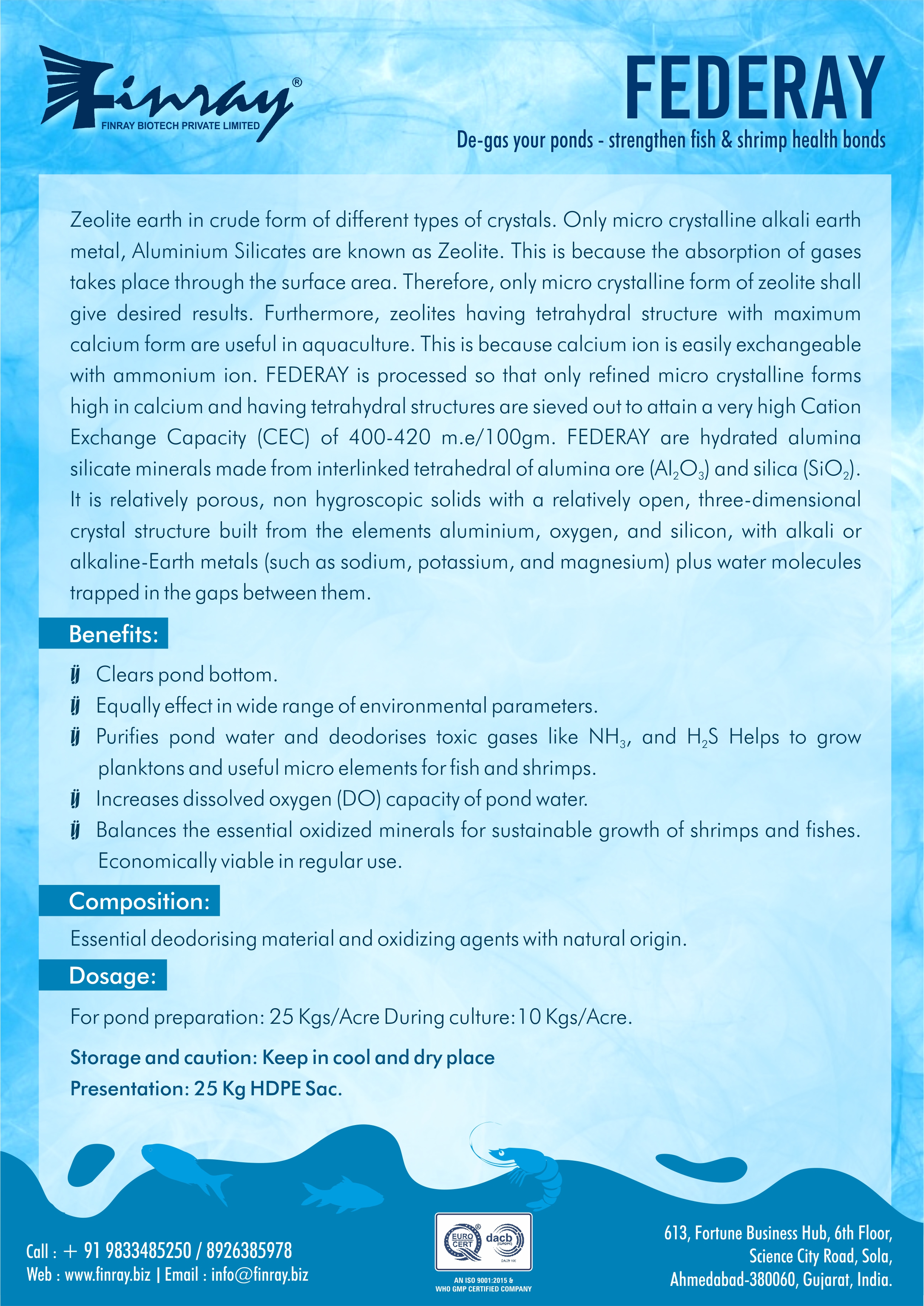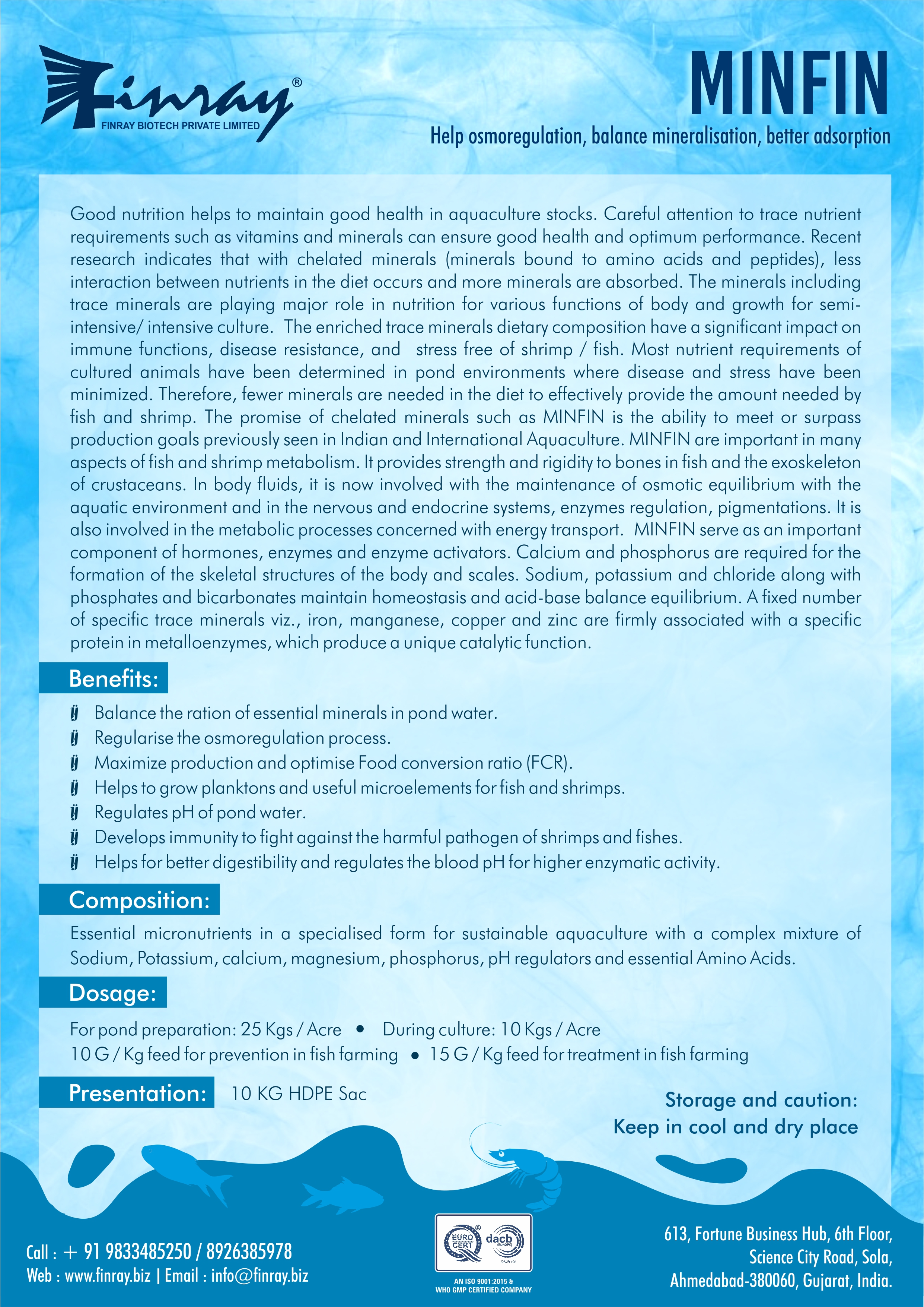 It Balance the ration of essential minerals in pond water. Regularise the osmoregulation process with Maximize production and optimise Food conversion ratio (FCR). Helps to grow planktons and useful microelements for fish and shrimps. Regulates pH of pond water Develops immunity to fight against the harmful pathogen of shrimps and fishes.